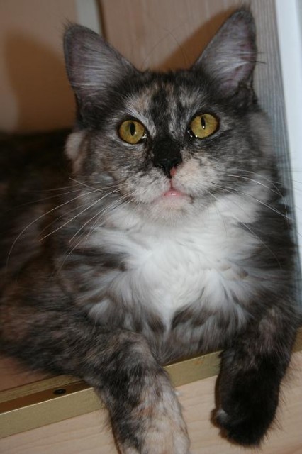 Cleo ist am 11.11.09 geboren. Sie hat ihr Schmuseabitur mit sehr gut bestanden. Wir hatten sie verkauft und später aus schlechter Haltung zurück geholt. Nach ihrer Gesundung ist sie nun auf der Suche nach einem neuen Dosenöffner. Cleopatra hat die Farbe silver tortie tabby w. white. Sie hat einen großen Silberanteil. Sie wäre auch für die Zucht geeignet, da sie aus einer seltenen Linie stammt. Die Urgrosseltern waren Direktimport Afrika und Amerika, der Inzuchtfaktor der Eltern nach verfolgt liegt bei 0 % bis in die 6. Generation zurück.