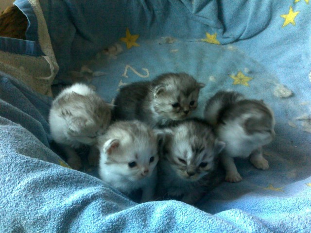 Geboren sind wir am 02.06.2010, sind also knapp am Mai vorbeigerutscht. Farblich verursachen wir ein ganz schön buntes durcheinander, wie ihr auf den Fotos seht, aber trotzdem sind wir alle echt gut gelungen. 2 von uns sind silver-shaded und die restlichen 3 sind bicolor.